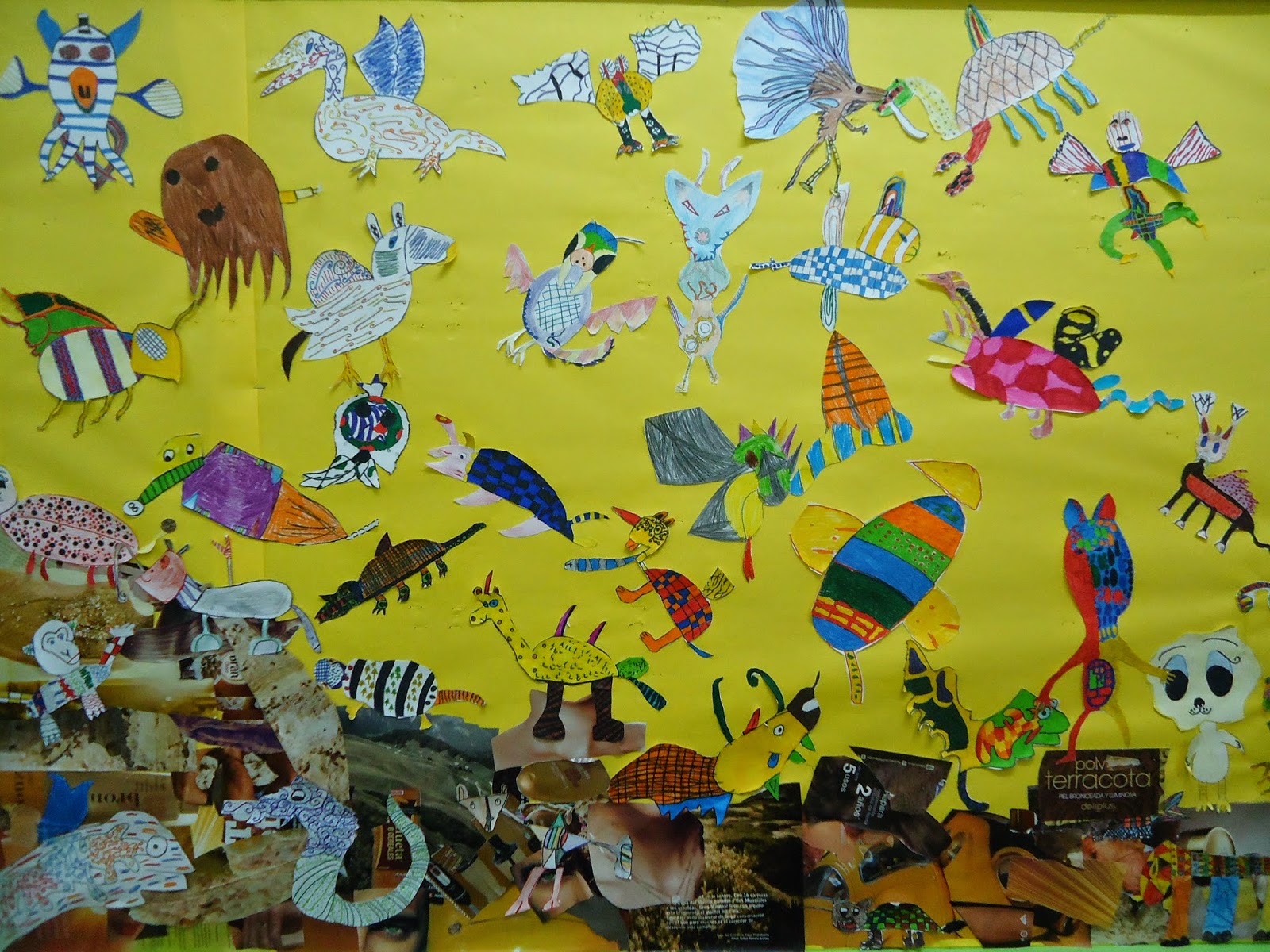 Després, seguint totes aquestes conclusions, vam crear i decorar animals híbrids de la mateixa manera com ho hagués fet en Kandinsky. Totes aquestes composicions les vam enganxar en el passadís sobre un fons groc. En la base vam enganxar retalls de revista de color marró perquè volíem representar el terra. Un cop estava tot enganxat, ho vam fotografiar. Aquesta fotografia va ser la tapa de l'àlbum del tercer trimestre. Aquí us la deixem. Va quedar preciós i molt acolorit.